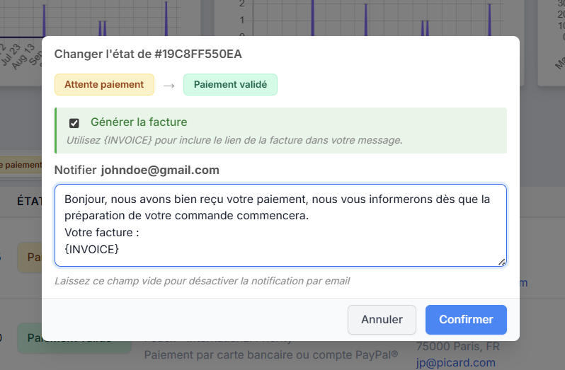 En choisissant de laisser le texte du message de notification vide seul le changement de statut de votre commande sera effectué mais si vous ajoutez un message de notification alors celui-ci sera envoyé à votre client par exemple afin de lui communiquer le numéro de suivi de son colis lors de l'expédition ou pour l'informer que sa commande est prête et qu'il peut venir la récupérer à votre point de vente par exemple dans le cas d'un Click & Collect.